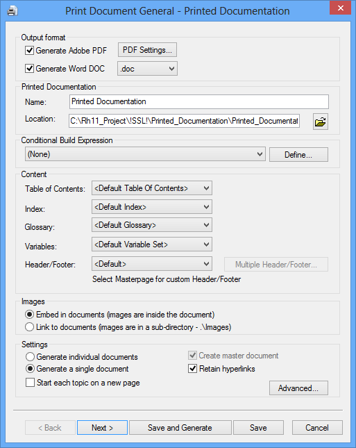 NameThis defaults from the name given to the layout and will appear on the cover of the document. You can change it to whatever you want, I have changed it from Printed Documentation to All Topics. Look for underscores in the default name, you will probably not want those on your cover. LocationBy default, RoboHelp will create a different folder for each layout you create using the name of the layout as the folder name. Unlike previous versions,RoboHelp 11 allows you to generate as many documents as you like to the same folder, provided of course they have different file names. A warning message will appear if you click Save and Generate and the folder already contains a document with the name specified. |