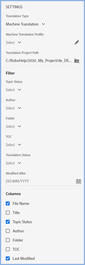 Translation Type You can select either Manual or Machine Translation. If you select Machine Translation, you will need to click the Edit icon and create a Profile as shown below. Translation Project Path The location of the foreign language project. Topic Status Initially this will show only Draft as a filter. As work progresses and the status of topics changes, In Sync, Out of Sync and Missing will be included. Author If author names have been assigned to topics, they will be listed here allowing you to select one or more for filtering. Folder You can limit the translation to a specific folder by selecting it here. TOC You can filter the topics shown by selecting a TOC. Translation Status Any of the items you see in the authoring area can be In Sync, Out of Sync or Missing. Select the status you want to see and it will be shown below the field. Modified After You can set a date to show only items that were modified after a certain date. Columns Tick the columns you want to see displayed in the authoring area.