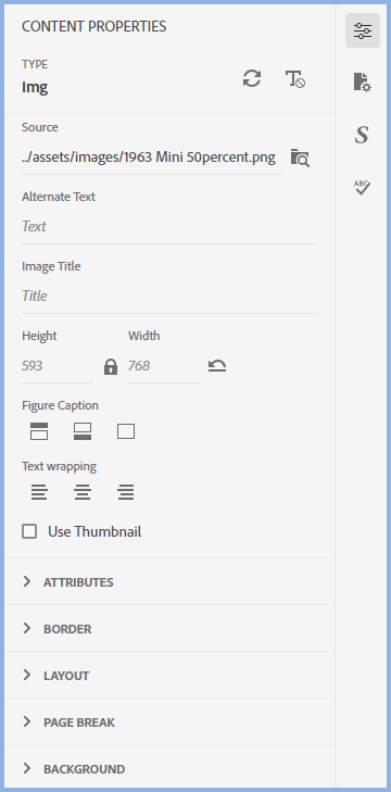 What you see here will depend on what has been selected in the topic. Here an image has focus and you can see the content properties that you can accept or change. There is more about that in Images, Videos and Captivate.
