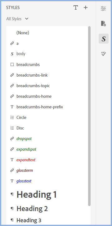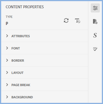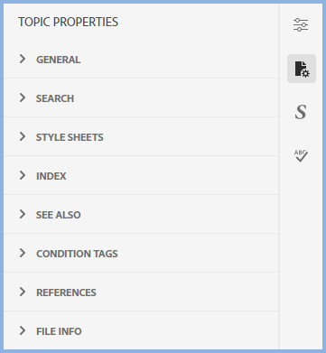 - Depending on what has focus, 4 will display relevant options. In this example the top icon on the right has focus so the Content Properties of whatever has focus in the content are shown. The other icons access the Topic Properties, the Styles and the Spell Check. Clicking one of the icons a second time hides the right panel.