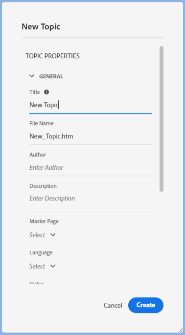New topics are created by right clicking in the Contents Panel or clicking the + icon and selecting New Topic. Enter the Topic Title and File Name, then in the Properties set up anything else you need to define.