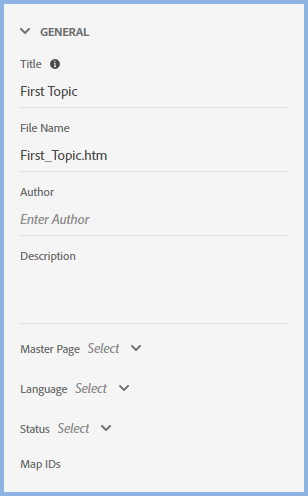 General The General properties are grouped here. The Description field expands automatically for longer content. The content of the Description area can be used in the search metadata, in cross references or it can be used for your own notes. In the Output Presets there is an option Use Topic Description As Search Context. Tick that if you want your descriptions used in that way or leave it clear if you want to use it for your own notes. Do be careful you don't use it for your own notes and tick the box. Could be awkward! This is also where you can apply a master page to your topics, the language to be used, the topic status and any map ids. |