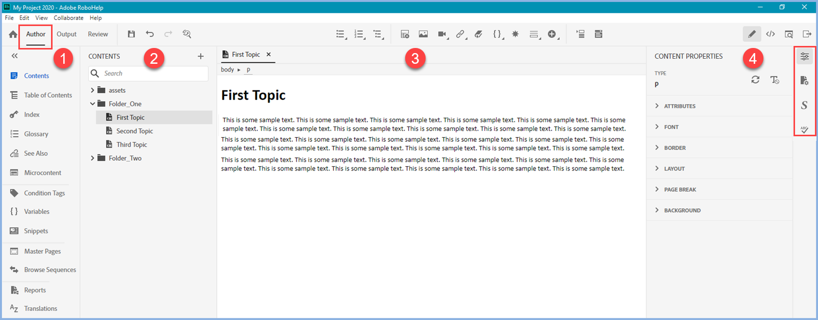 Here some text has focus. Type Displays the tag for whatever has focus in the content. The icons allow you to Update the CSS from any inline styling applied and Clear Formatting removes any inline style from wherever the cursor is applied. Attributes ID allows advanced users to apply an ID to an element. Class - If the style is a class such as p.red, the class name will appear here. Also you can add a class name by typing in just the class such as "red" (without quotes) but note it must be letter and case perfect or it will have no effect. Translate Select enables you to include/exclude topics from Translation. Condition Tags can be applied to topic content here. Condition Tags for the whole topic are applied in Topic Properties. Font Apply inline changes to selected text. To apply the change to a whole paragraph, click within it rather than select the whole paragraph. Border Apply a border to the selection. Layout Sets margins, padding, float and clear properties. Page Break You can control where page breaks occur when printing the topic, both from a browser or in PDF and Word outputs. To always have a page break before any Heading 1, for example, you would set the Page Break Before option to Always in the dropdown. To avoid a page break you would set the style to Avoid. The dropdowns contain the most commonly used options and these are defined in the Adobe RoboHelp online help. Advanced users may want to use the other options supported by CSS3. These can be set by editing the CSS in Source View. Background Apply a background image or shading. In the code you may see rgba as well as rgb values. The "a" is for alpha channel, which specifies the opacity of the color. |